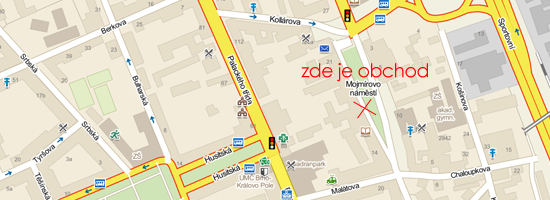 Prodejnu můžete najít na Mojmírově náměstí 15 v Králově poli. Nachází se jen pár minut od zastávky Husitská.