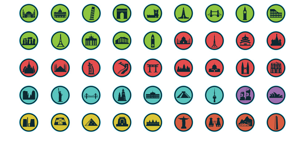 Ve spodní části mapy jsou světové památky barevně rozdělené podle kontinentů pro snadnou orientaci. Celkem až 45 památek z celého světa, u kterých si můžete označit, které jste již navštívili.