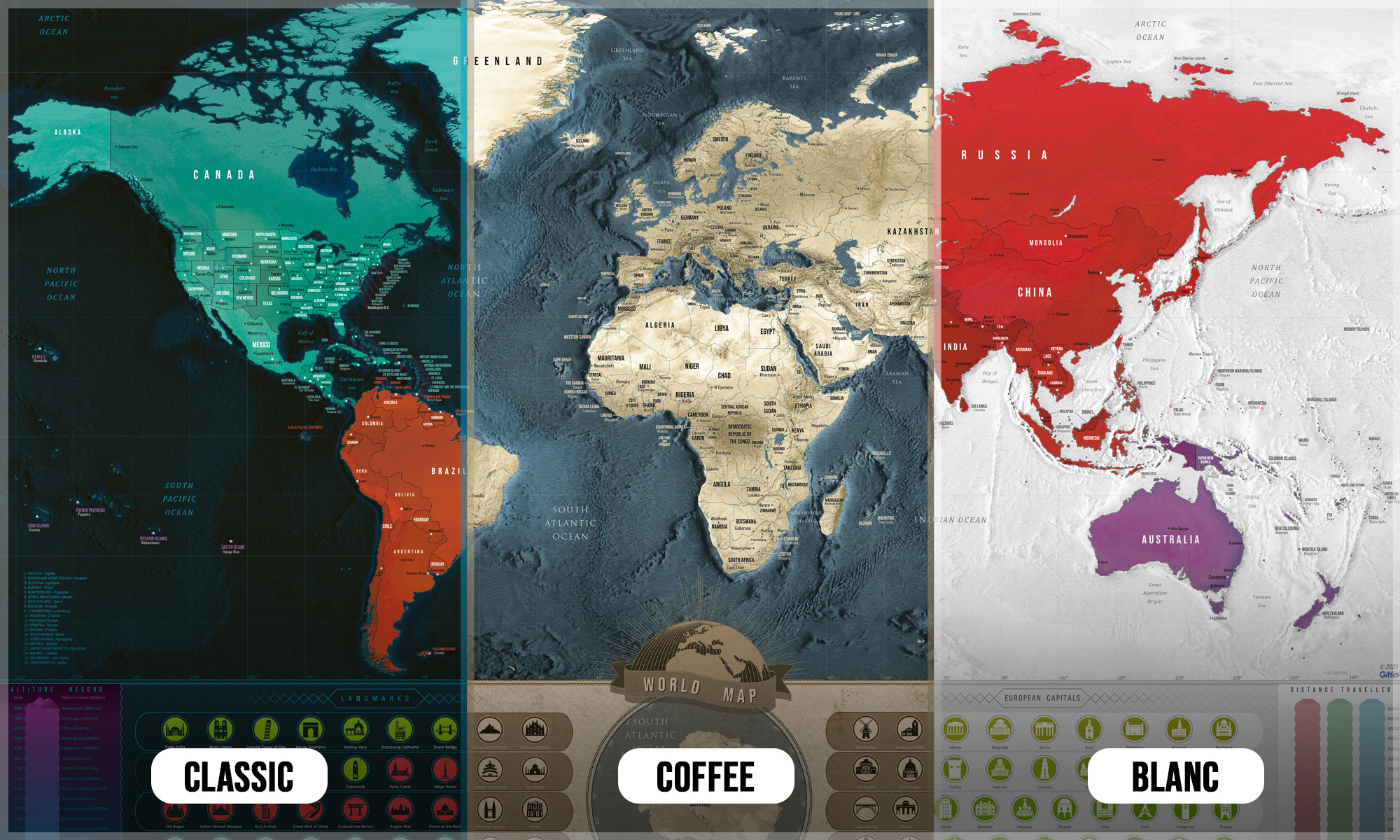 Kvalitní stírací vrstva dodává mapě luxusní vzhled a je snadno odstranitelná. Po setření se objeví barevná mapa světa, na které si můžete zaznamenat, která místa jste již navštívili. Vyberte si svůj styl.